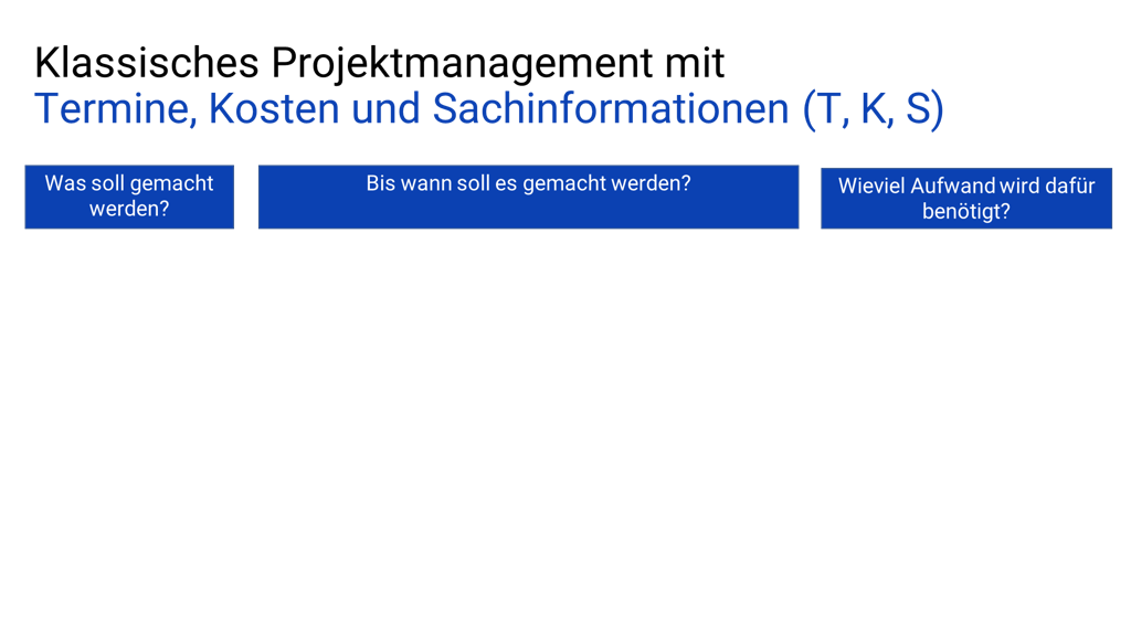 Mit einem Vorhaben/Projekt möchte das Management bestimmte Ziele (inhaltliche Beschreibung) in einer bestimmten Zeit (Termine) mit einem bestimmten Aufwand (Kosten) erreichen. Man kann jedes Vorhaben/Projekt besser verstehen, wenn man es in die Bereiche (T,K,S): – Termine (bis wann sollen die Arbeitspakete fertig sein) – Kosten (wieviel Geld steht für das Vorhaben zur Verfügung) – Sache (was genau soll inhaltlich mit den Vorhaben/Projekt erreicht werden) aufteilt.